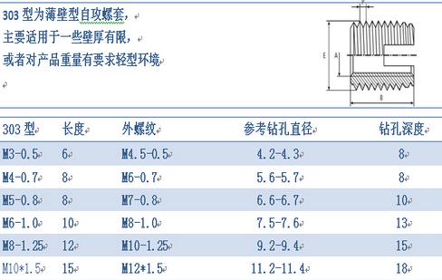 24h咨询热线13069364703 薄壁型北京自攻螺套外观上看主要有两种区分,一种是一端开槽型的,另一种是一端三圆孔型的,其中开圆孔型的又分为307型和308型两种,307型和308型外观主要区别就是同一直径下,长度和外径大小有所区分。以上各种型式螺套均具有自行攻牙功能。